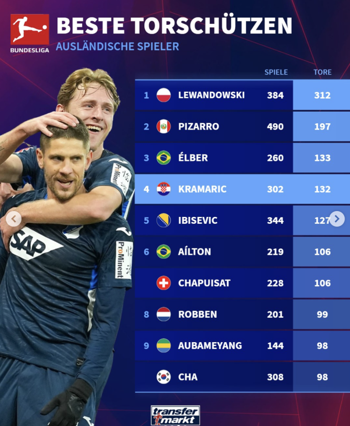 莱万共打进312球高居榜首,皮萨罗以197球排名第二。本轮上演帽子戏法的克拉马里奇已打进132球排名第四,距离第三埃尔伯的133球仅差一球。